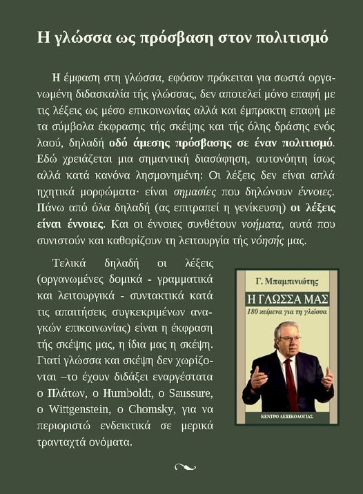 6 Ιουνίου 2018Υπολογίζεται ότι ένας μορφωμένος ομιλητής μιας γλώσσας γνωρίζει περί τις 20.000 λεξικές οικογένειες τής μητρικής του γλώσσας. Αυτό σημαίνει ότι ο ομιλητής μιας γλώσσας όπως είναι η Ελληνική που κάθε λεξική της οικογένεια– από τη φύση, την παράδοση και την καλλιέργεια τής γλώσσας αυτής– έχει ένα πλήθος παραγώγων και συνθέτων λέξεων, δηλ. ο μέσος μορφωμένος Έλληνας γνωρίζει (χρησιμοποιεί και καταλαβαίνει) τριπλάσιο τουλάχιστον αριθμό λέξεων. Ό,τι συνήθως αποκαλούμε «πλούτο» τής ελληνικής γλώσσας, δεν έχει μόνο να κάνει με την καλλιέργεια που ευτύχησε να έχει η Ελληνική λόγω τής μακραίωνης, αδιάκοπης και ποιοτικής για μεγάλα διαστήματα χρήσης της, αλλά και με την ίδια τη δομή της, με τους υψηλούς βαθμούς παραγωγής και σύνθεσης λέξεων που αυξάνουν τη συνοχή, τη διαφάνεια και τη δηλωτική της ικανότητα και αποτελούν κύρια πλευρά τής δύναμής της.