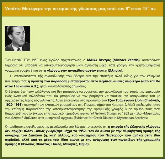 ΤΟΝ ΙΟΥΝΙΟ ΤΟΥ 1952, πριν από 92 χρόνια, ένας Άγγλος αρχιτέκτονας, ο Μάικλ Βέντρις (Michael Ventris), ηλικίας τότε 30 ετών, ανακοίνωσε δημόσια ότι μπόρεσε να αποκρυπτογραφήσει μιαν άγνωστη μέχρι τότε γραφή, την κρητομυκηναϊκή γραμμική γραφή τύπου Β, στην οποία είναι γραμμένες πολλές πήλινες πινακίδες από την Κρήτη, τις Μυκήνες, την Πύλο κ.α. και, το κυριότερο, ότι η γλώσσα των πινακίδων αυτών είναι η Ελληνική.